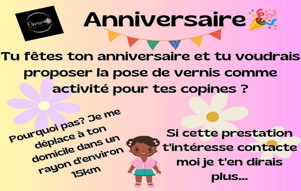 Depuis fin 2022, Obsession’L vous accueille à Calonne sur la Lys pour des prestation d’onglerie ainsi que des massages. Elle peut également se déplacer chez vous pour les animations de vos enfants.