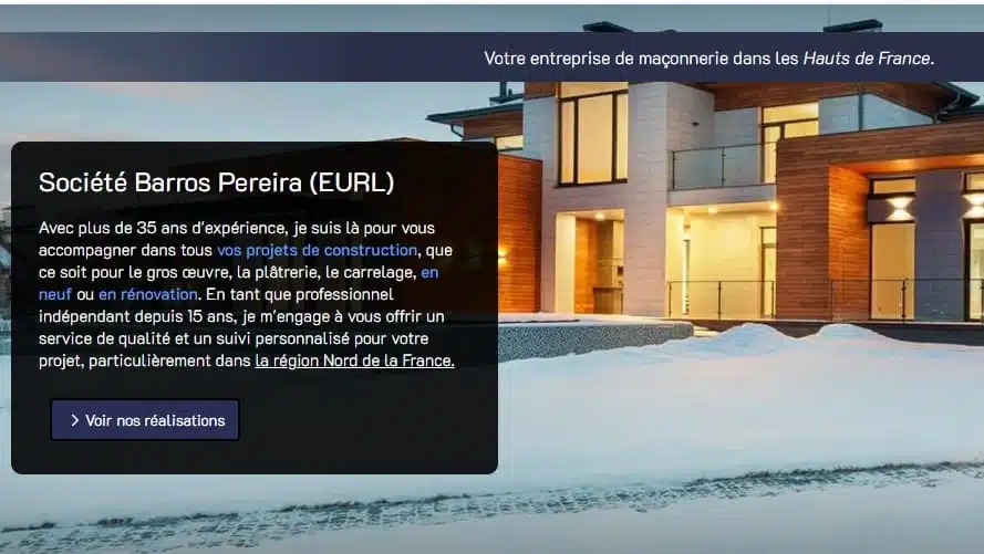 La société Barros Pereira (EURL), à plus de 35 ans d’expérience, le gérant est là pour vous accompagner dans tous vos projets de construction, que ce soit pour le gros œuvre, la plâtrerie, le carrelage, en neuf ou en rénovation. En tant que professionnel indépendant depuis 15 ans, il s’engage à vous offrir un service de qualité et un suivi personnalisé pour votre projet.