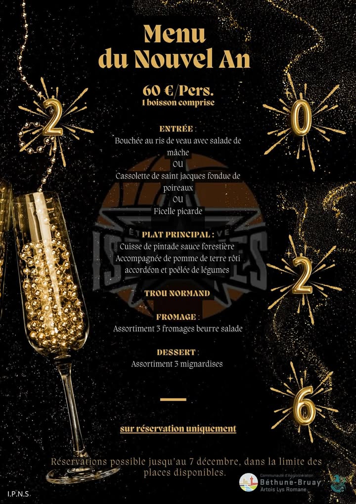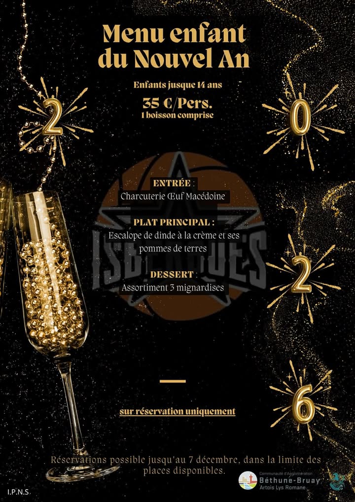 Une soirée de la Saint Sylvestre est programmée ce 31 décembre au soir dans la salle Basly d’Isbergues. La date limite des réservations a été repoussée. Le repas adulte est à 60€ (les détails ici), et celui des enfants est à 35€ (les détails ici). Un événement organisé par le club de Basket de la ville d’Isbergues. Pour toute question et inscription, n’hésitez pas à contacter Corinne Varlet de 9h à 12h et après 18h au 06 29 99 45 17